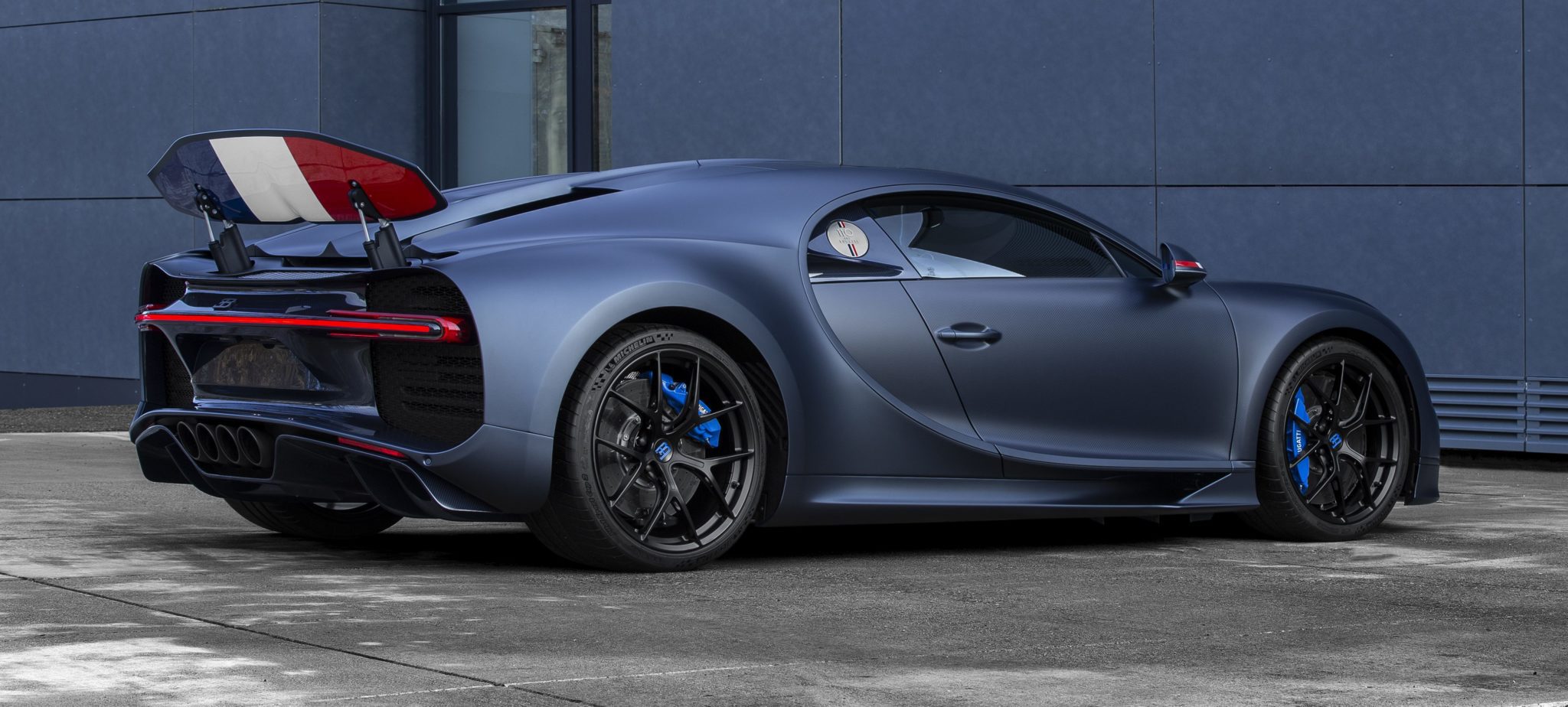 La parte trasera está dominada por el difusor y el parachoques en acero brillante azul carbón con el sistema de escape de color negro mate contrastante. La parte inferior del alerón trasero cuenta con la bandera francesa en todo su ancho. El mecanismo del alerón trasero está anodizado en negro mate para armonizar con el logotipo Ettore Bugatti negro mate en el centro de la parte trasera, las ruedas negro mate y el sistema de escape deportivo a juego. El techo Sky View, que consta de dos paneles de vidrio fijos sobre los asientos del conductor y del pasajero, disponibles como opción en el Chiron, es una característica estándar de la edición especial. Estos paneles tienen una estructura laminada recientemente desarrollada con vidrio delgado y cuatro capas intermedias.