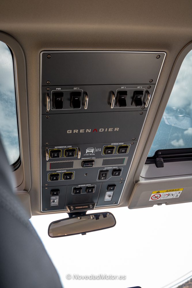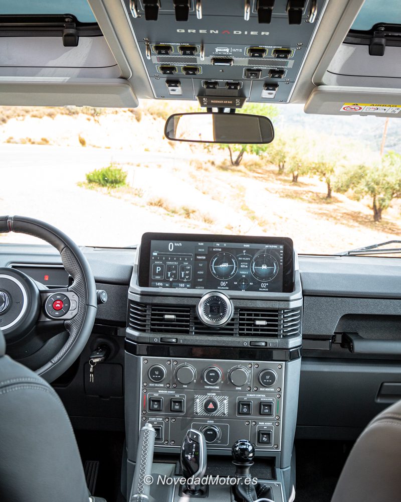 Respecto al interior, mencionar que tiene numerosos botones que te recuerdan que no estás en un todoterreno convencional, (tiene botones incluso en el techo, y bastantes), destacando su brújula real (no digital), su pantalla central con numerosa información como grados de inclinación, tanto lateral como frontal, y un botón rojo en el volante que es un cláxon más «amigable» para los ciclistas, manteniendo el cláxon normal en el volante.