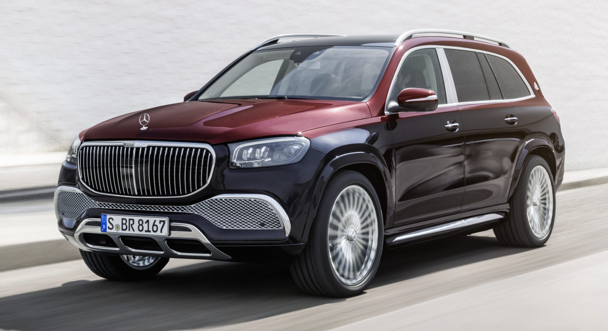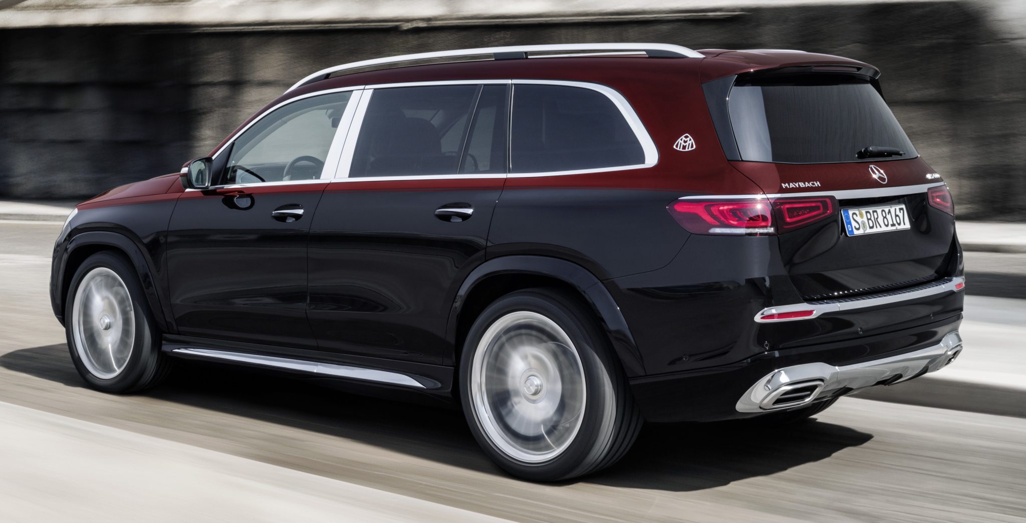La estrella Mercedes domina la vista frontal desde su posición clásica sobre el capó, y las finas barras verticales cromadas de la calandra del radiador Maybach se asemejan a un tejido de raya diplomática. Llamativos elementos cromados en torno a las ventanillas laterales y los insertos cromados en los embellecedores laterales añaden nobleza y elegancia a la vista de perfil. Las llantas de 22 ó 23 pulgadas responden a un diseño exclusivo para este modelo. La ejecución de 23 pulgadas asume el diseño de raya diplomática del frontal. Los embellecedores de la salida de escape con un pequeño perfil transversal acentúan la identidad del Mercedes-Maybach. Esto mismo puede decirse del emblema de la marca, visible en varios lugares, como los montantes D. Una particularidad específica de Maybach es el acabado bicolor de la carrocería, disponible en ocho elegantes combinaciones cromáticas.